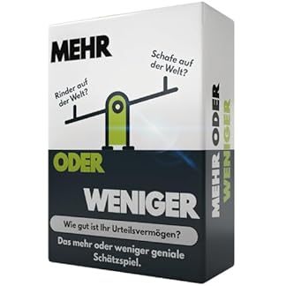 Angebot! Ursprünglicher Preis war: €11,73€7,99Aktueller Preis ist: €7,99.Produkt kaufenMehr oder Weniger – Ratespiel ab 2 Personen – 110 Karten 320 Fragen – Spiel für Erwachsene & Kinder ab 10 Jahren – Tolles Kartenspiel für 2+ Spieler – Familienspiel, Gesellschaftsspiel oder zu zweit