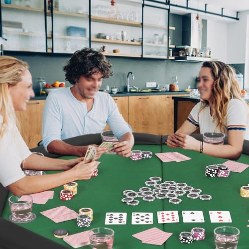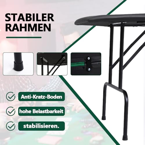 Material – Die grüne Tischplatte des Pokertisches besteht allesamt Polyester-Filzstoff, der verschleißfest und nicht leicht zu brechen, leicht zu reinigen und saugfähig ist. Die Ränder des Pokertisches sind mit gepolsterten Armlehnen versehen, die mit schwarzem Kunstleder überzogen und leicht zu reinigen sind.