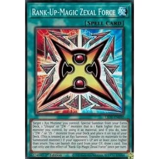 Wähle 1 Xyz-Monster, das du kontrollierst; beschwöre 1 „Utopia“- oder „ZW -“-Monster, dessen Rang 1 höher wie der des Monsters ist, das du kontrollierst, wie Spezialbeschwörung von deinem Alleinig Deck, indem du es wie das Material verwendest und falls du dies tust, nimm 1 „ZW -“- oder „ZS -“-Monster von deinem Deck und lege es auf dein Deck. (Dies wird wie Xyz-Beschwörung behandelt. Transferiere sein Material an das beschworene Monster.) Falls dein Gegner mindestens 2000 LP mehr hat wie du: Du kannst diese Karte von deinem Friedhof beachten; ziehe 1 Karte. Du kannst diesen Effekt von „Rangsteigerungszauber Zexal-Kraft“ aber einmal pro Spielzug verwenden.