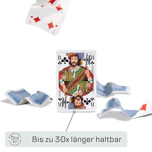 Wasserfeste, schmutzabweisende und robuste Spielkarten ganz 100% Kunststoff. Bis zu 30 mal länger haltbar qua traditionelle Papierkarten.